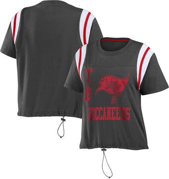 The Women's WEAR by Erin Andrews Pewter Tampa Bay Buccaneers Cinched Colorblock T-shirt is a stylish and spirited way to show unwavering support for the Tampa Bay Buccaneers. Distressed screen print graphics and an adjustable drawstring at the waist hem add flair to your game day attire. The front yoke seam and cotton construction ensure comfort and durability, making this T-shirt a must-have for any true Buccaneers fan.