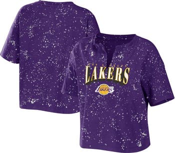 The Women's WEAR by Erin Andrews Purple Los Angeles Lakers Bleach Splatter Notch Neck T-Shirt is a must-have for any devoted Los Angeles Lakers fan. This cropped T-shirt features a unique bleach splatter design that varies on each shirt, making it a one-of-a-kind piece. The notch neck and screen print graphics add a touch of style, while the soft fabric ensures comfort all day long. Whether you're cheering on the Lakers at the game or just showing your support, this T-shirt is the perfect way to represent your favorite team.