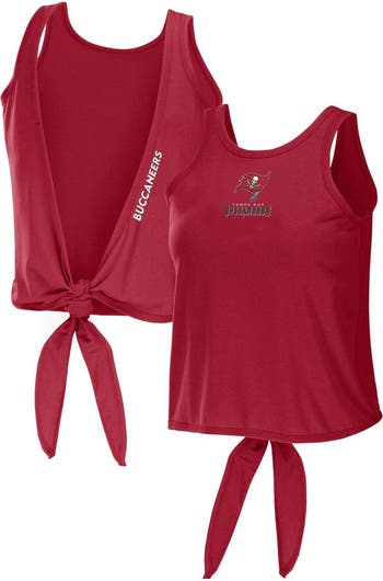 The Women's WEAR by Erin Andrews Red Tampa Bay Buccaneers Open Back Twist Tie Tank Top is the perfect way to show your support for the Tampa Bay Buccaneers. With its stylish open back and comfortable twist tie design, this tank top is a must-have for any fan. The screen-printed Tampa Bay Buccaneers logo lets everyone know who you're rooting for, whether you're at the game or just hanging out.