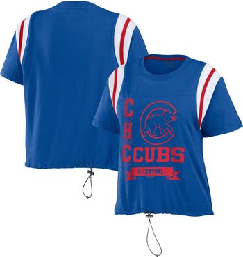 The Women's WEAR by Erin Andrews Royal Chicago Cubs Cinched Colorblock T-shirt is the perfect way to show your support for the Chicago Cubs. With distressed details for a vintage look and adjustable drawcord with toggle in the waist hem, this shirt is both stylish and comfortable. Rib-knit insets in the shoulders and front yoke seam add a touch of sophistication, while the Chicago Cubs logo proudly displayed on the front shows your unwavering loyalty to the team.