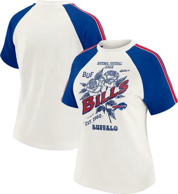 Showcase your Buffalo Bills pride with this Sleeve Stripe Distressed Raglan T-Shirt from WEAR by Erin Andrews. The distressed screen print graphics give it a vintage look that adds a touch of timeless style. The contrast-color sleeve stripes and raglan sleeves make this t-shirt a unique addition to your Buffalo Bills collection.