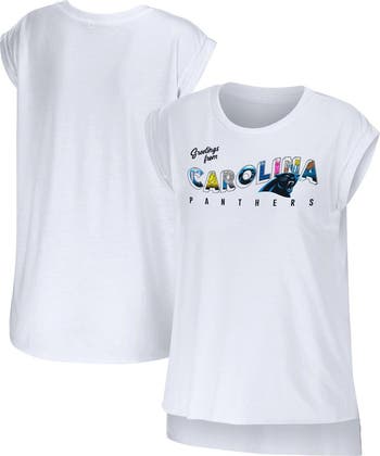 Women's WEAR by Erin Andrews White Carolina Panthers Greetings From Muscle T-Shirt