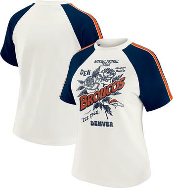 Showcase your Denver Broncos pride with this Sleeve Stripe Distressed Raglan T-Shirt from WEAR by Erin Andrews. The distressed screen print graphics give it a vintage look that adds a touch of timeless style. The contrast-color sleeve stripes and raglan sleeves make this t-shirt a unique addition to your Denver Broncos collection.