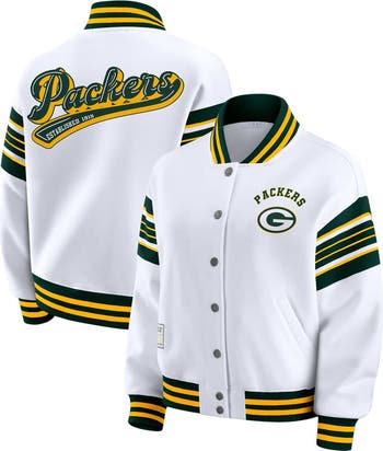 Rep your Green Bay Packers as cooler weather returns with this Full-Snap Fleece Sweatshirt Jacket. Designed by WEAR by Erin Andrews, this midweight jacket is perfect for moderate temperatures. The rib-knit collar, cuffs, and hem feature team-colored stripes, providing a snug fit and durable stretch, while the two front hand pockets offer convenient storage. Emblazoned with the team name and logo graphics on the left chest and back, along with an embroidered team patch at the right hem, this jacket proudly displays your Green Bay Packers pride.