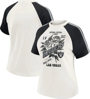 Women's WEAR by Erin Andrews White Las Vegas Raiders Sleeve Stripe Distressed Raglan T-Shirt