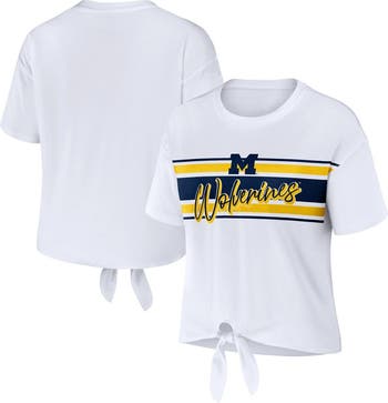 Women's WEAR by Erin Andrews White Michigan Wolverines Striped Front Knot Cropped T-Shirt