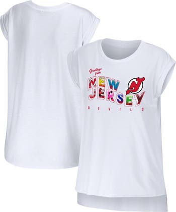The Women's WEAR by Erin Andrews White New Jersey Devils Greetings From Muscle T-shirt is a must-have for any true New Jersey Devils fan. This stylish tee features a crew neck, raw-edged droptail hem, and screen-print graphics that proudly display your allegiance to the Devils. Made from soft cotton, this t-shirt is comfortable to wear all day long, whether you're cheering on the team at the game or showing your support around town.