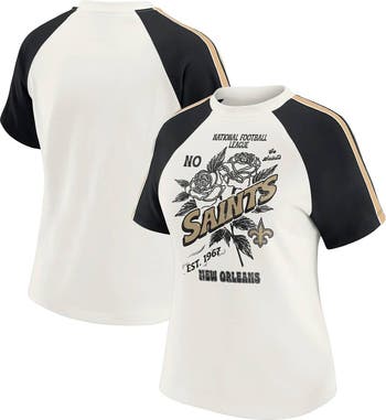 Showcase your New Orleans Saints pride with this Sleeve Stripe Distressed Raglan T-Shirt from WEAR by Erin Andrews. The distressed screen print graphics give it a vintage look that adds a touch of timeless style. The contrast-color sleeve stripes and raglan sleeves make this t-shirt a unique addition to your New Orleans Saints collection.