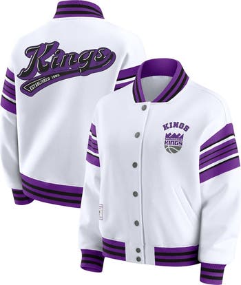 Show off your unwavering support for the Sacramento Kings spirit with this Snap Front Fleece Sweatshirt from WEAR by Erin Andrews. This midweight jacket features team name and logo graphics printed on the left chest and back with a patch applique woven at the right hem, creating a vintage look reminiscent of classic varsity jackets. The rib-knit collar, cuffs and hem provide a snug fit and durable stretch, letting you move freely while staying warm while the two front pockets provide extra storage space.
