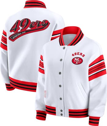 Rep your San Francisco 49ers as cooler weather returns with this Full-Snap Fleece Sweatshirt Jacket. Designed by WEAR by Erin Andrews, this midweight jacket is perfect for moderate temperatures. The rib-knit collar, cuffs, and hem feature team-colored stripes, providing a snug fit and durable stretch, while the two front hand pockets offer convenient storage. Emblazoned with the team name and logo graphics on the left chest and back, along with a woven team patch at the right hem, this jacket proudly displays your San Francisco 49ers pride.