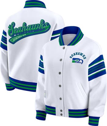 Rep your Seattle Seahawks as cooler weather returns with this Full-Snap Fleece Sweatshirt Jacket. Designed by WEAR by Erin Andrews, this midweight jacket is perfect for moderate temperatures. The rib-knit collar, cuffs, and hem feature team-colored stripes, providing a snug fit and durable stretch, while the two front hand pockets offer convenient storage. Emblazoned with the team name and logo graphics on the left chest and back, along with a woven team patch at the right hem, this jacket proudly displays your Seattle Seahawks pride.
