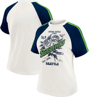 Showcase your Seattle Seahawks pride with this Sleeve Stripe Distressed Raglan T-Shirt from WEAR by Erin Andrews. The distressed screen print graphics give it a vintage look that adds a touch of timeless style. The contrast-color sleeve stripes and raglan sleeves make this t-shirt a unique addition to your Seattle Seahawks collection.