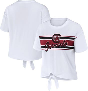 Celebrate your unwavering South Carolina Gamecocks spirit with the Women's WEAR by Erin Andrews White South Carolina Gamecocks Striped Front Knot Cropped T-Shirt. This stylish tee features a front tie knot and screen print graphics that proudly display your allegiance to the Gamecocks. The slightly dropped shoulders add a touch of casual comfort, making it perfect for game days or any day you want to show your support for the South Carolina Gamecocks.
