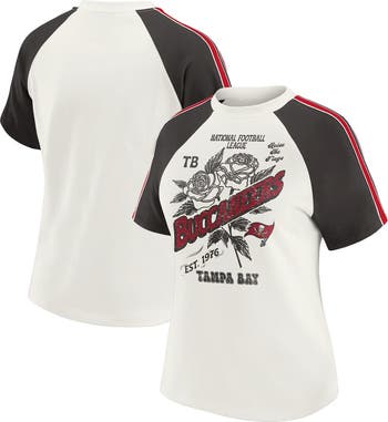 Showcase your Tampa Bay Buccaneers pride with this Sleeve Stripe Distressed Raglan T-Shirt from WEAR by Erin Andrews. The distressed screen print graphics give it a vintage look that adds a touch of timeless style. The contrast-color sleeve stripes and raglan sleeves make this t-shirt a unique addition to your Tampa Bay Buccaneers collection.