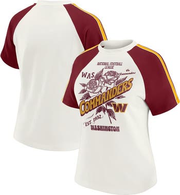 Showcase your Washington Commanders pride with this Sleeve Stripe Distressed Raglan T-Shirt from WEAR by Erin Andrews. The distressed screen print graphics give it a vintage look that adds a touch of timeless style. The contrast-color sleeve stripes and raglan sleeves make this t-shirt a unique addition to your Washington Commanders collection.