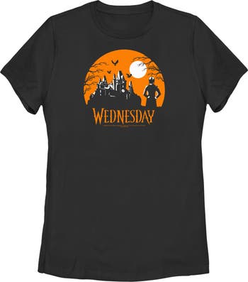 - Strut your stuff with this stylish new Halloween women's t-shirt that is perfect for the scariest time of the year! Featuring Wednesday's silhouette standing in front of a haunted house and the classic TV logo printed below.