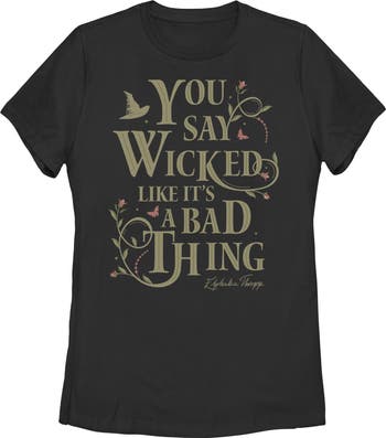 - Real style and friendship are truly unlimited with this new women's t-shirt that is perfect for whenever you're feeling a little defiant! Featuring Elphaba's iconic phrase, "You Say Wicked Like It's a Bad Thing," adorned with flowers and butterflies across the front.