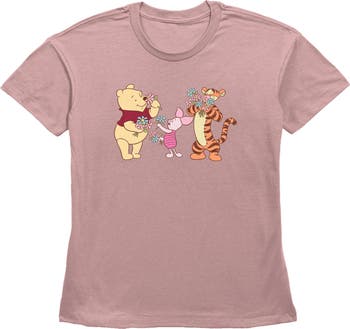 - What a special spring day you'll have with this stylish new women's straight fit t-shirt! Featuring Pooh, Tigger, and Piglet happily smelling flowers across the front.