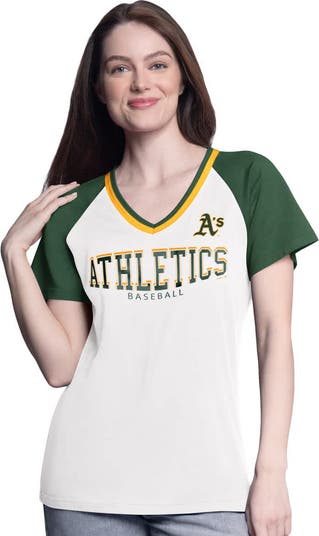 Enjoy a classic look with a touch of Athletics spirit in this G-III 4Her by Carl Banks Ball Park Raglan V-Neck T-Shirt. This stylish top features contrast-color raglan sleeves and a stripe design at the collar for a sporty, vintage-inspired aesthetic. Plus, the screen printed team wordmark and logo on the front let you show your Athletics pride.