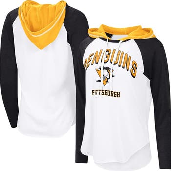 Add a touch of flair to your Pittsburgh Penguins fandom with this G-III 4Her by Carl Banks VIP Raglan Long Sleeve Hoodie T-Shirt. This stylish top features contrast-color sleeves for a bold look that declares your Pittsburgh Penguins fandom. Plus, the screen print team wordmark and logo at the chest leave no doubt who you'll be cheering for on game day.