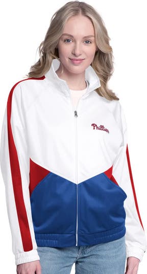 Get ready for game day with this Philadelphia Phillies Rally Rhinestone Raglan Full-Zip Track Jacket from G-III Sports by Carl Banks. This stylish track jacket features a modern tapered fit and color block design, making it a fashionable choice for any Philadelphia Phillies fan. With screen printed graphics and a full-zip design, it's perfect for layering over your favorite game-day gear.