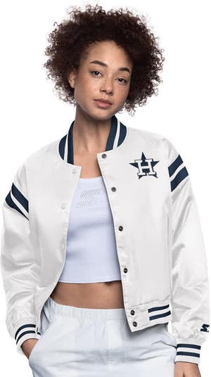Show off your Houston Astros pride with this Starter Full Count Full-Snap Varsity Jacket. This stylish varsity jacket features a timeless design with rib-knit stripes on the collar, cuffs, shoulders, and hem for a sporty look. The dropped shoulders and cropped hem provide a trendy, relaxed fit, perfect for layering over your favorite Houston Astros gear.