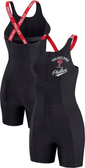 Elevate your Philadelphia Phillies game day look with this Bodycon Quarter-Zip Romper from WEAR by Erin Andrews. This sleek and sporty romper features a bodycon fit that flatters your figure, while the quarter-zip front allows for adjustable styling. Made with a blend of polyester and elastane, this Philadelphia Phillies romper moves with you, providing all-day comfort whether you're cheering from the stands or enjoying a casual outing.