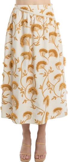 Cut from a crisp linen-kissed blend, this flared midi skirt is textured in feathery fringed stitching.