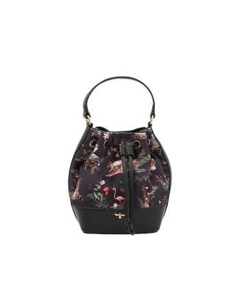 Escape to Wonderland any day of the week with this velvet Bucket Bag. The print features a rich array of fantastical foliage, while curious creatures abound in the form of flamingos, deer and dodos. Suitably whimsical and perfectly proportioned for storing your essentials, the piece is finished with gold-toned hardware and our signature Fable bee plaque.