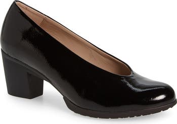 An almond toe and block heel frame a sophisticated leather pump set on a well-cushioned footbed for lasting comfort.