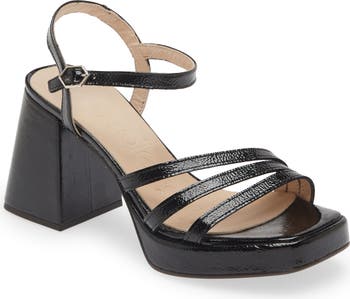 Asymmetric straps arch across this glossy leather sandal lifted on a perfectly pitched chunky heel and built for all-day comfort with memory-gel cushioning.