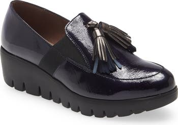 Patent leather and dangling tassels distinguish a chic loafer lofted by a lugged wedge.