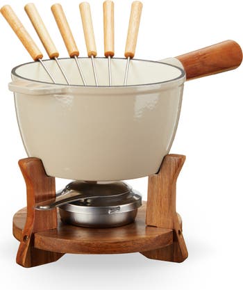 Warm, gooey cheese and melted chocolate are treats best shared, and this fondue set has everything you need. A cast-iron pot, chrome burner, and wood base and stand provide a solid foundation, while 6 numbered fondue forks ensure everyone gets a dip.