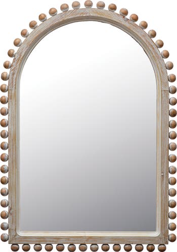 This wood ball-framed arched wall mirror will add style and character to the space. This mirror features a stylishly arched silhouette encased in a distressed wood frame with beaded detail. The natural wood finish adds a warm and rustic touch to the decor. Whether displayed in the living room, bedroom, or entryway, this mirror will enhance any style from transitional to Scandinavian. The mirror has hanging mechanisms for easy installation and can be hung vertically only. The mirror is made of reclaimed wood and glass, making it durable. The mirror measures 23.75 inches wide by 33.75 inches high, making it a perfect size for any space. This mirror is a stunning piece that will add a touch of sophistication to any home.