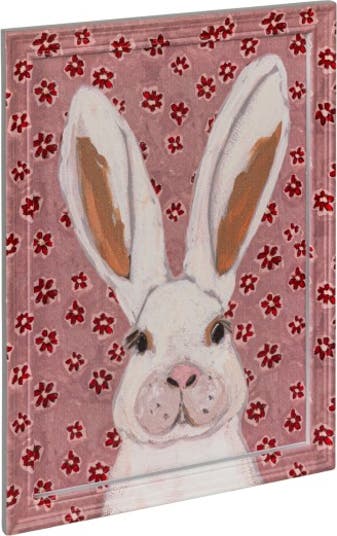 - An enchanting wall décor featuring a charming rabbit image surrounded by flowers, framed in wood