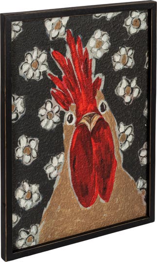 - A charming wall décor featuring a vibrant rooster image surrounded by flowers, framed in wood