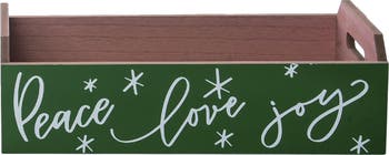- Decorative 15.79" Green "Peace Love Joy Merry Christmas" container made of durable MDF wood, perfect for indoor tabletop use during the Christmas season, featuring a charming design and easy care with spot or wipe clean maintenance.