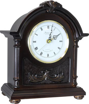 This exquisite Mantel clock features a dark finish. Rich and deeply colored it is timeless and exquisite. The dial is bright and perfectly brings forward the roman numerals for your ease. This classic Mantel clock is a stunning addition to any room, whether it is above a fireplace or on a desk. Has 4 chime modes and a volume control toggle.