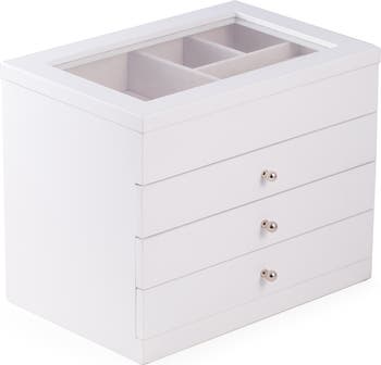 Keep all your baubles organized in this wooden jewelry box designed with a see-through top compartment and three drawers.