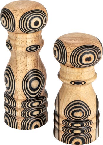 - A pair of round and sleek wood salt and pepper mills that have a natural and black color and an inlaid circles design that adds a modern and geometric touch