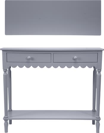 - A charming wood console table in a soothing lavender color with a scalloped edge design, featuring two drawers and one shelf