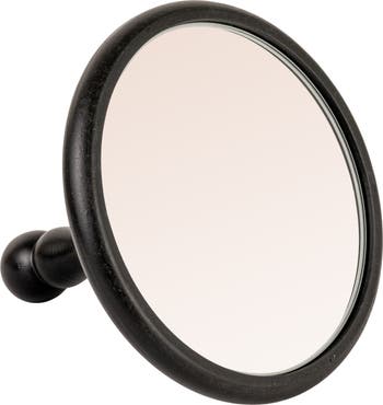 This Round Wood Table Mirror with a Stand in black is a chic and functional addition to any home. The sleek black wood frame and stand provide a stylish look that complements transitional, minimalist, farmhouse, and French country decor styles. This round mirror can be placed on a table or shelf, adding functionality and a decorative touch to any space. Made of durable pine wood with a clear mirror, it measures 7.75 inches in diameter and 7.5 inches in height, making it a versatile and elegant accent piece for the home. Whether used for checking reflection before heading out the door or simply as a decorative piece, this mirror will surely enhance any room's aesthetic.