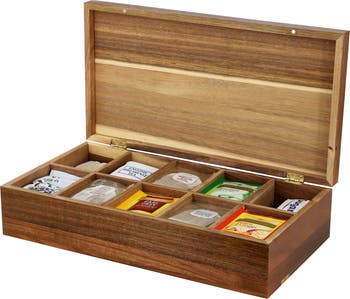 Keep your tea collection organized and stylish with the MegaChef Acacia Wood 14.25 x 7.5 Inch 10 Compartment Tea Box. Made from high-quality acacia wood, this dark brown tea box features a smooth, rich finish that enhances the wood's natural beauty and durability. With its sleek rectangle shape, this tea box offers a spacious 10-compartment design, perfect for storing and organizing all your favorite tea bags. Whether you prefer herbal, black, green, or specialty teas, this box provides ample space to keep everything neat and easily accessible. The large 10-compartment capacity makes it an excellent storage solution for tea lovers who want to keep their collection tidy and organized. The acacia wood tea box adds a touch of rustic charm to your kitchen, dining room, or countertop while providing a practical, everyday solution for tea storage. Easy to maintain, simply wipe clean with a damp cloth to preserve its beautiful finish. Add the MegaChef Acacia Wood Tea Box to your home for an elegant, functional way to store your tea selection in style! Perfect for gifting or as a personal addition to your tea-drinking routine.