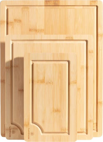 Set of 3 wooden cutting boards with juice groove, heavy duty nonslip design, knife‑safe surface, durable, lightweight, and easy to clean.