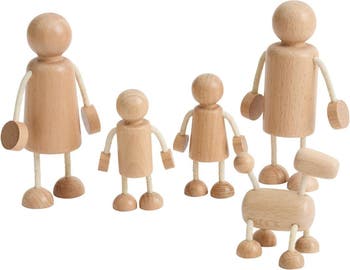 3 years & up. Bring play to life with a set of wooden play people and pets. Complete with figurines to represent a family of 4 and their pet dog, the Wooden Family Playset is the perfect addition to dollhouses and pretend play zones. Rounded edges and a natural wooden color provide a beautiful, subtle way for children to engage in play. Set includes two adult-sized figures, two child-sized figures, and one dog.