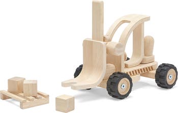 Any child will love the functional and realistic features of this wooden Forklift Toy that will encourage imaginative play. A back knob directs and guides the forklift from side to side, while a side knob moves the pallet for up and down. The Forklift toy and wooden cubes help promote fine motor skills, logical thinking and help develop concentration and hand-eye coordination.