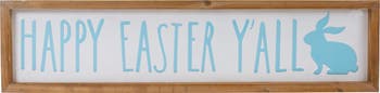 Celebrate the season with this wooden-framed "Happy Easter Y'all" sign, designed to bring a cheerful accent to your spring décor. Featuring bright blue lettering and an adorable Easter bunny, this spring wall decoration is ideal for egg hunts, parties, or everyday seasonal displays. The rustic wooden frame adds a charming farmhouse appeal, making it a great addition to entryways, mantels, or gallery walls. Whether used as a standalone piece or part of a larger arrangement, this sign creates a warm and inviting Easter atmosphere. Product Features: Features a blue bunny rabbit Printed with the phrase "Happy Easter Y'all" Ready to hang with alligator hook on back No assembly required Recommended for indoor use Dimensions: 6.25"H x 26"W x 1"D Material(s): wood/metal
