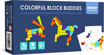 This Geometrical Puzzle Learning Game from MiDeer contains 21 different irregular shaped wooden blocks & 20 two-sided game cards (4 different levels). You can develop abstract mathematical thinking while having fun playing. Drawer box easy to open and store. Create any pattern you like. Great educational tool for children to learn abstract thinking in a fun way.