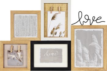 Capture your cherished moments with this wall collage of photo frames. Easily tell a story as this collage beautifully showcase your pictures through five carefully arranged frames. With the word "Love" intricately designed into the frame, it adds a touch of sentiment and warmth to any room. Tiny wooden clothes pins hold photos in two of the frames for a whimsical touch. Display in bedrooms and living rooms or give as a gift. Product Features: Wall collage with 5 rectangular and square photo frames Clothes pins and rope holds 2 of the photos Designed with the word “Love” in a metal detail Frames are cream, black and natural wood finishes Can be hung on the attached triangle D-ring hooks For indoor use only Dimensions: 13.75"H x 20.75"W x .5"D Holds photos: 8" high x 6" wide, 7" hign x 5" wide and 5" high x 5" wide Clothes pin hods photos: 4.5" high x 5" wide and 4.5" high x 3" wide Material(s): wood/metal/rope/plastic