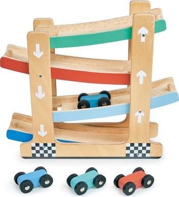 This classic wooden car ramp racer toy is a great game to play with friends. Made from solid wood, the 4 little coloured cars are designed to flip over on to each level as they zoom down the track.